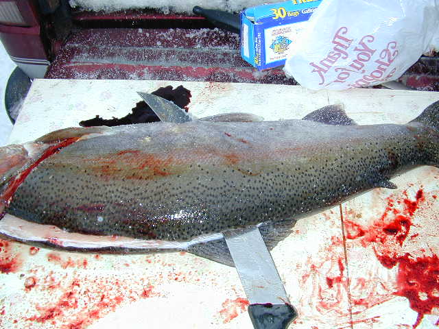 Now, you'll have an award winning product like you'll see in the super market without the tearing and parting of the peal and slice method.  Also, and most important the flesh hasn't been soaked in the gut juice for lack of a better word, but let's face it, that's just what it is.  Cut the fillet in pieces, as not to break apart the flesh if it's large enough.  If you're going to freeze the fish, leave the skin on as it cuts down on the freezer burn and freeze the fish in water with a little bit of salt.  Shelf life on fish is only recommended for 3 months so don't think that fillet is going to retain it's flavor forever.  I strongly recommend sharing fresh with friends, or relatives.  Any Salmon, or Trout species does not like being frozen.  I great alternative is canning fresh fish over sticking it in the dreaded freezer.