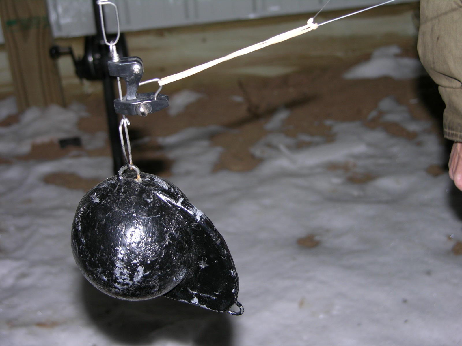 There's an ever increasing vertical pull of the line against the release mechanism, multiplied as you fish deeper. Not to mention the pull of any attractor/lure that varies with trolling speeds. When a fish first hits several factors come into play. Cannonballs are not stationary objects. They get pulled in any direction a fish decides to go before the rigger release apparatus breaks free. Then, there's the risk of line slipping thru a release, negating hooking power before the big show has began. Properly installed rubber bands lock the distance and do not slip. Plus, bands are a helluva lot easier on your line than any release. Being easier on your line leads to zero line failure & not buying costly tackle. Click for another article "how-to" install bands Black's Downrigger Releases offer an added benefit, as your cannonball hangs directly straight. Not titled up at a weird angle do to water pressure of the line cutting vertically thru a 100' feet of water. Those that hang releases on the back off the rear fin of their cannonballs might want to pay close attention to this reel-fact! Rubber Bands offer an elastic cushioning effect. Plus, a constant positive 4 pound pull with a good 18 inches of play, or stretch to keep your hook tightly stuck. This helps a hook penetration immensely. Underwater videos have recorded the full force once a Salmon begins to feel the hook go in. Just like a surface Steelhead/Rainbow on the tear, there's a lot of violent head shaking, along with body contorting spins. This is the time when the elastic stretch of 18" to 30" will keep your hooks imbedded into your next victim. Releases & bands are less mass to pull thru the water. Unencumbered by additional clips that might carry a negative underwater signature. This is a compact stealthy approach that will prove itself. Put another way, when there's hoards of fish, who cares if you lose a few hits? When times are lean? Then is its ultra important to capitalize on every opportunity! |