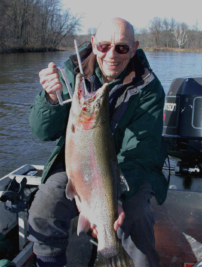Now, this Steelhead was a bright-silvery chrome hen, fresh in from Lake Michigan.  She had a vile, contemptuous attitude akin of a pissed-off pit-bull!  This large hen shot upstream and did her best to cut the line on our anchor rope.  However, Warren's skillful duty with the rod coaxed the Steelie into the clear.  After a hectic 10 minutes, Capt. Tom slid the net underneath a beautiful, radiantly-bright 9 pound hen.  Hey, we were in business and under any circumstances ...we were not gonna get skunked today!